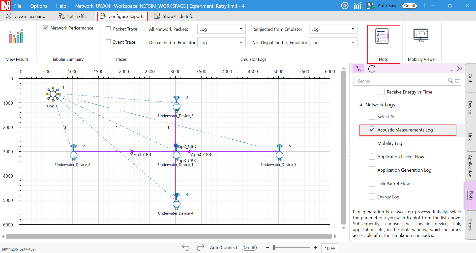 NetSim provides protocol-specific logs for UWAN libraries, which users can enable before running a simulation. These can be enabled by clicking on configure reports in top ribbon \(>\) clicking on plots \(>\) choosing as desired and running the simulation.
