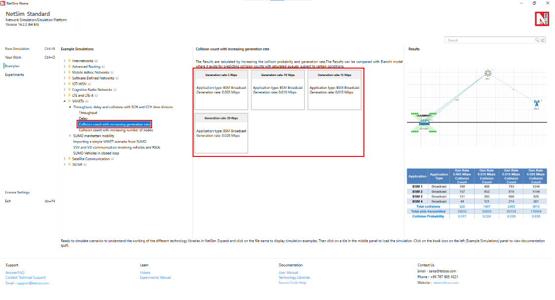 Open NetSim and Select Examples > VANETs > Throughput, delay and collisions with SCH and CCH time division > Delay then click on the tile in the middle panel to load the example as shown in below screenshot.