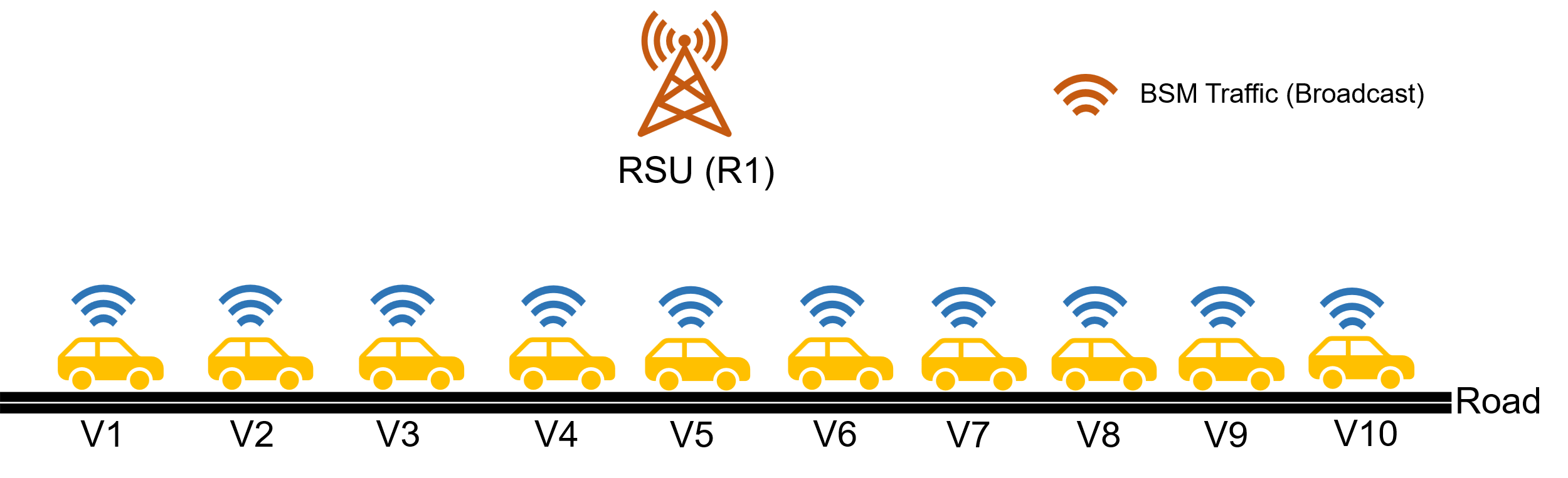 The BSM application is configured with packet size of 20B and inter-packet arrival time of 320 \(\mu s\), while the CBR application is configured with packet size of 1460B and inter-packet arrival time of 5840 \(\mu s\).