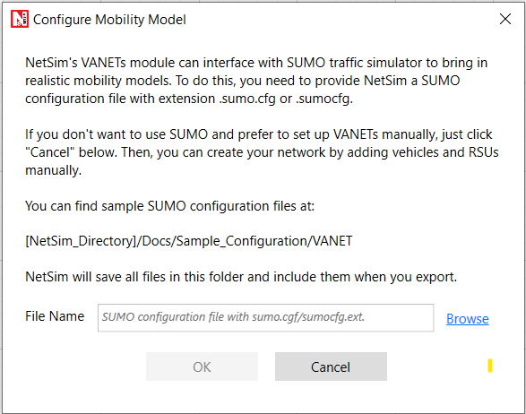 <NetSim-Installation-Directory>\Docs\Sample Configuration\VANETfolder.Users can either use a Sumo configuration file which is provided inside NetSim’s installation directory or use a different user specified SUMO configuration file. This .cfg file contains the path of NETWORK file and VEHICLES file.