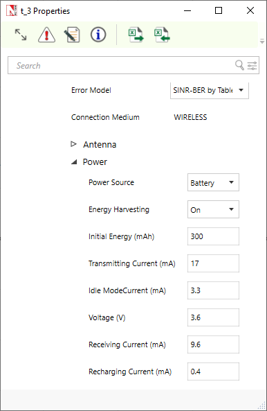 | Initial Energy | Local | 0.001–1000 mAh | A node has an initial value which is the level of energy the node has at the beginning of the simulation. |
