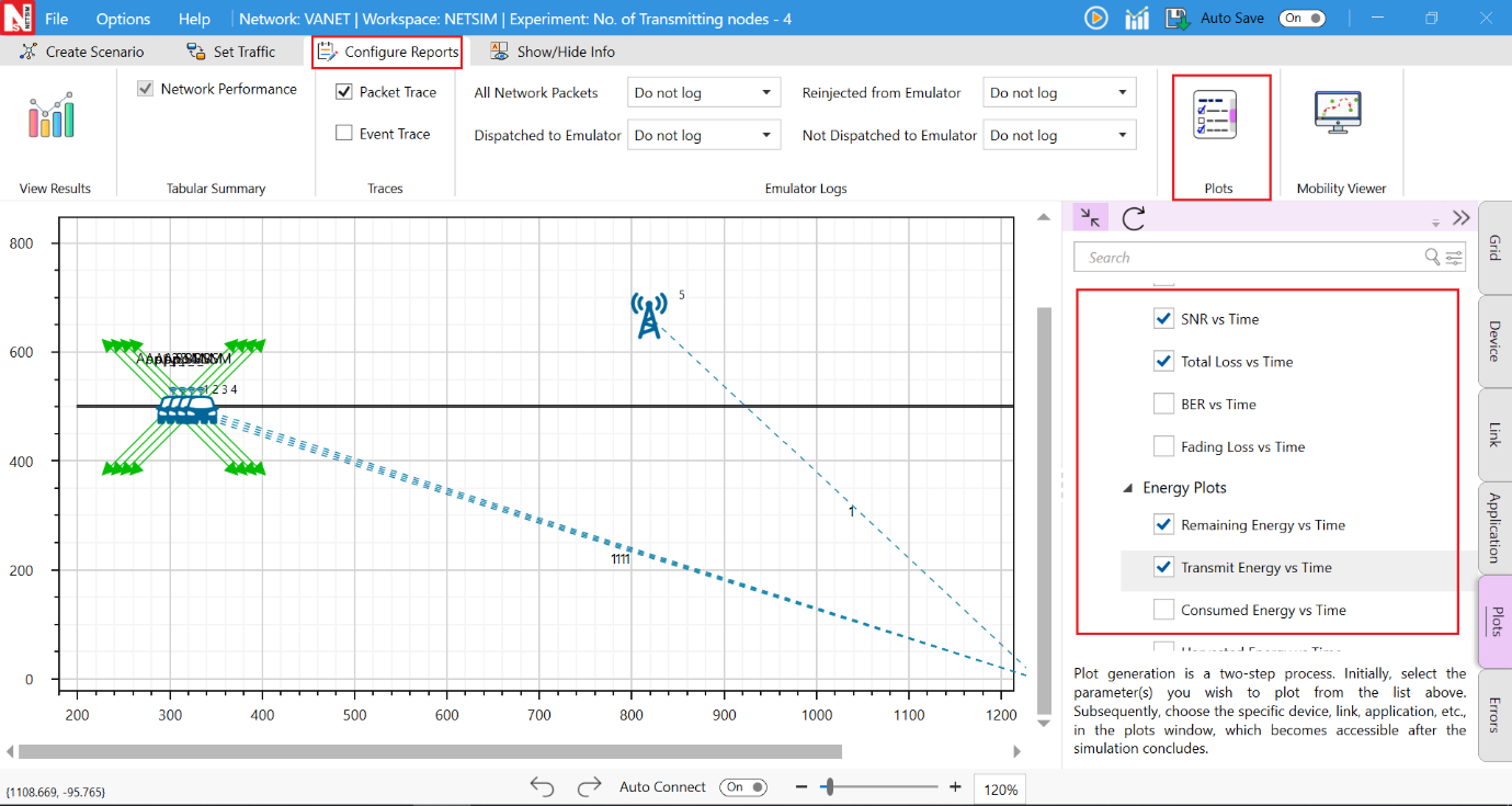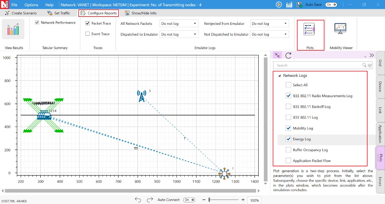 NetSim provides protocol-specific logs for VANET libraries, which users can enable before running a simulation. These can be enabled by clicking on configure reports in top ribbon > clicking on plots > choosing as desired and running the simulation.