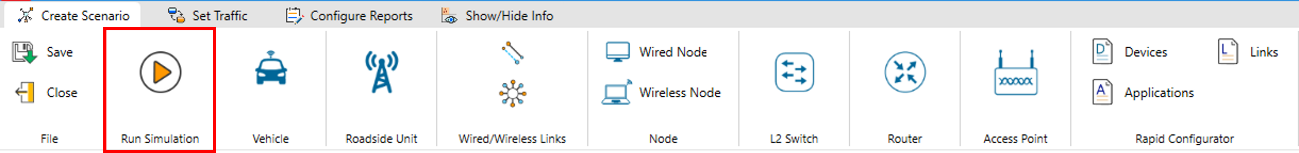 Click on Run Simulation icon on the top toolbar. Simulation time is set from the Configuration file of Sumo. The simulation has three options.