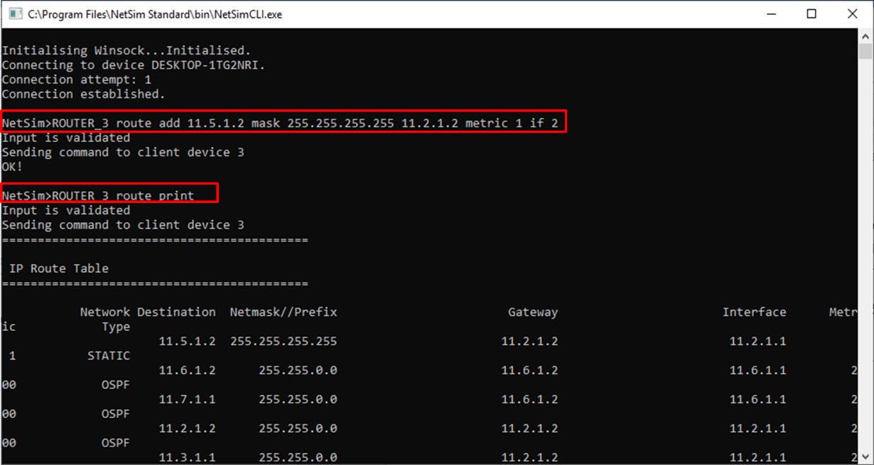- Type the following commands on the NetSim CLI console, in the > \<DeviceName with Device_ID> route add \<destination IP > address> MASK \<subnet mask> \<gateway IP address> > \<metric> if \<interface #> format.