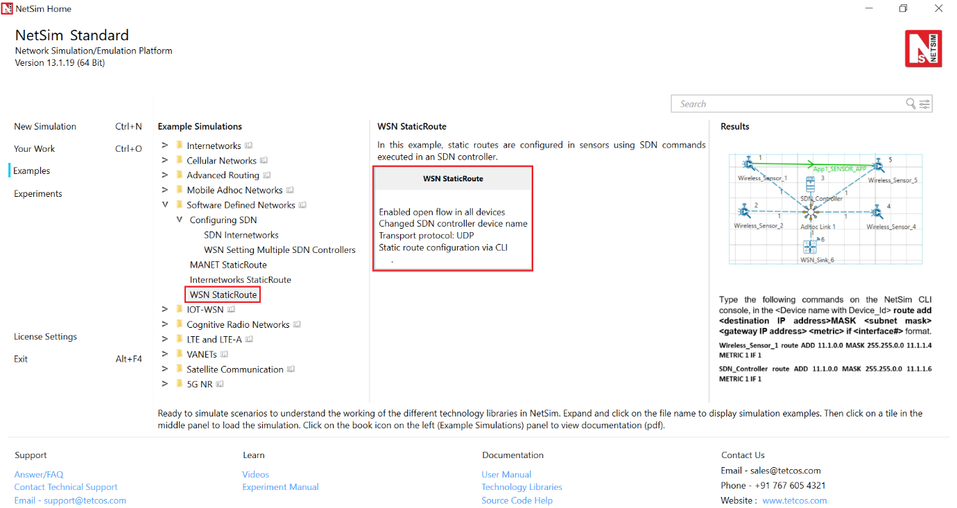 Open NetSim and Select Examples > Software Defined Networks > WSN StaticRoute then click on the tile in the middle panel to load the example as shown in below screenshot