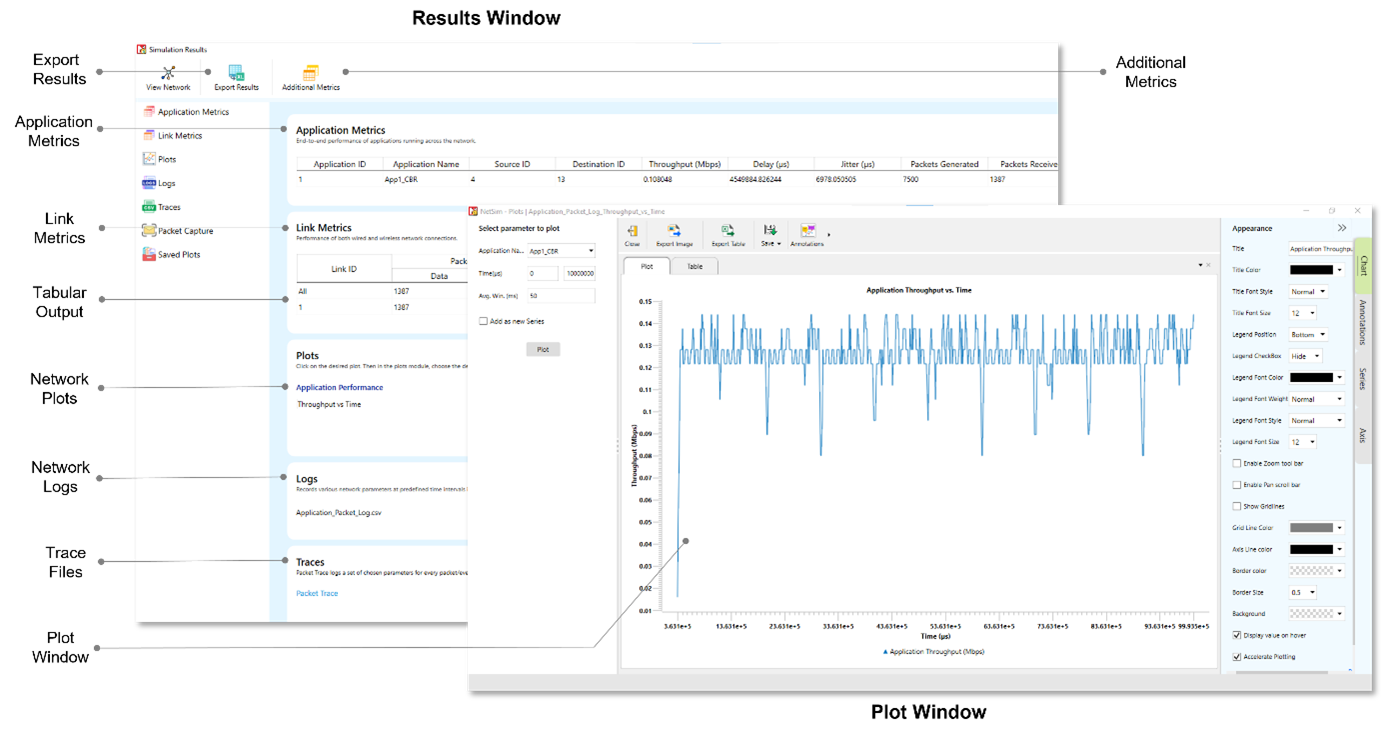 Figure-2: The Result dashboard and Plot window shown in NetSim after completion of simulation.