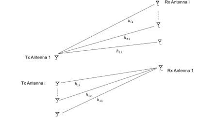 Figure-1: Top) Single transmit antenna and multiple receive antennas. Bottom) Multiple Transmit and single receive antenna. In both, \(h_{ij}\) represents the channel between the \(i^{\text{th}}\) receive antenna and the \(j^{\text{th}}\) transmit antenna.