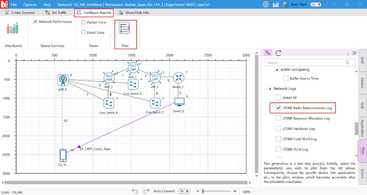 Click on the Configure report tabs and then click on the Plots icon in the toolbar to enable LTENR Radio measurements under Network Logs and Beamforming Gain vs. Time in LTENR Radio Measurements as shown in Figure-4 and Figure-5.