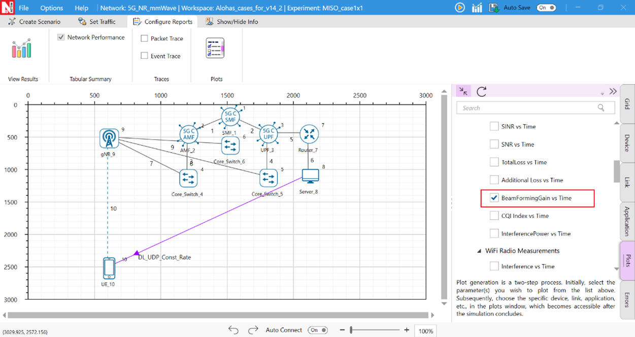 Run simulation for 10s, note down the Application Throughput obtained from the Application Metrics table in the NetSim Results dashboard. Similarly, observe the average Beamforming Gain in dB obtained for the DL application from the generated NetSim plot.