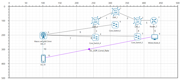NetSim UI would display the network topology shown in the screenshot below when you open the example configuration file.