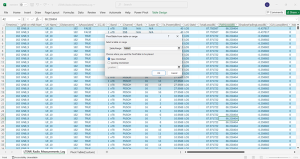 Figure-78: LTENR Radio Measurements Log file pivot table showing the filtering process of DL/UL column
