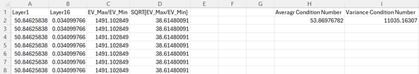 Now in the next column, enter the formula, \(= \lbrack@Layer1\rbrack/\lbrack@Layer16\rbrack\) to calculate \(EV\_ max/EV\_ min\) . Note that the eigenvalues of Layer 1 are \(\lambda_{\max}\) while the eigenvalue of Layer16 is \(\lambda_{\min}.\ \)Rename the column suitably.