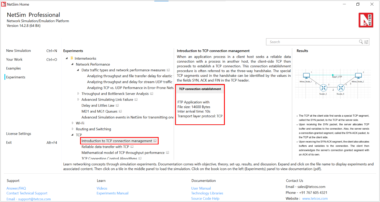 Open NetSim and click on Experiments >Internetworks> TCP> Introduction to TCP connection management then click on the tile in the middle panel to load the example as shown in below Figure-3.