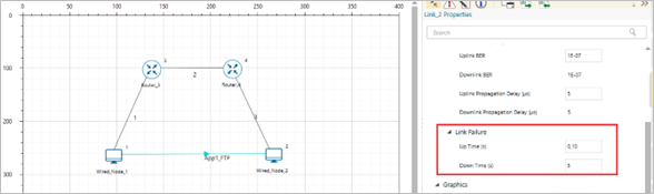 Construct a scenario with 2 nodes and 2 routers. Introduce the link failure and recovery at Router3. Set Uptime as 0, 10, and the downtime as 5. This means the link is up from 0s – 5s, then down from 5s - 10s and then up again after 10s. Explain what you observe in between 5th second and 10th second using the packet trace. Does TCP reestablish connection after 10s?