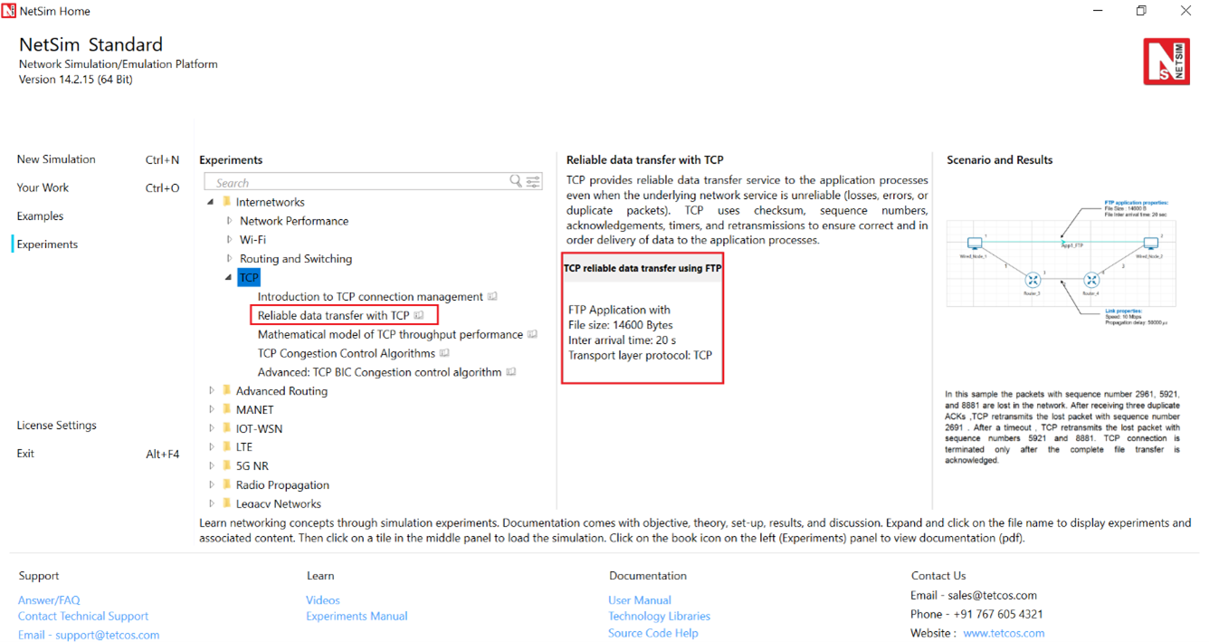 Open NetSim and click on Experiments > Internetworks> TCP> Reliable data transfer with TCP then click on the tile in the middle panel to load the example as shown in below Figure-8.