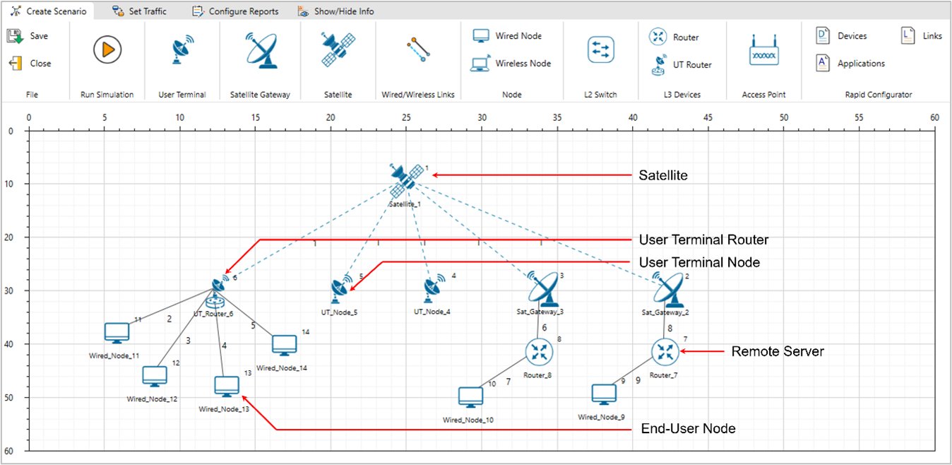 In NetSim, the satellite communication network library interfaces with Internetworks library. This means users can connect Satellite gateway and User Terminals to devices such as Routers, Switches Wired nodes, Access point and Wireless nodes etc.