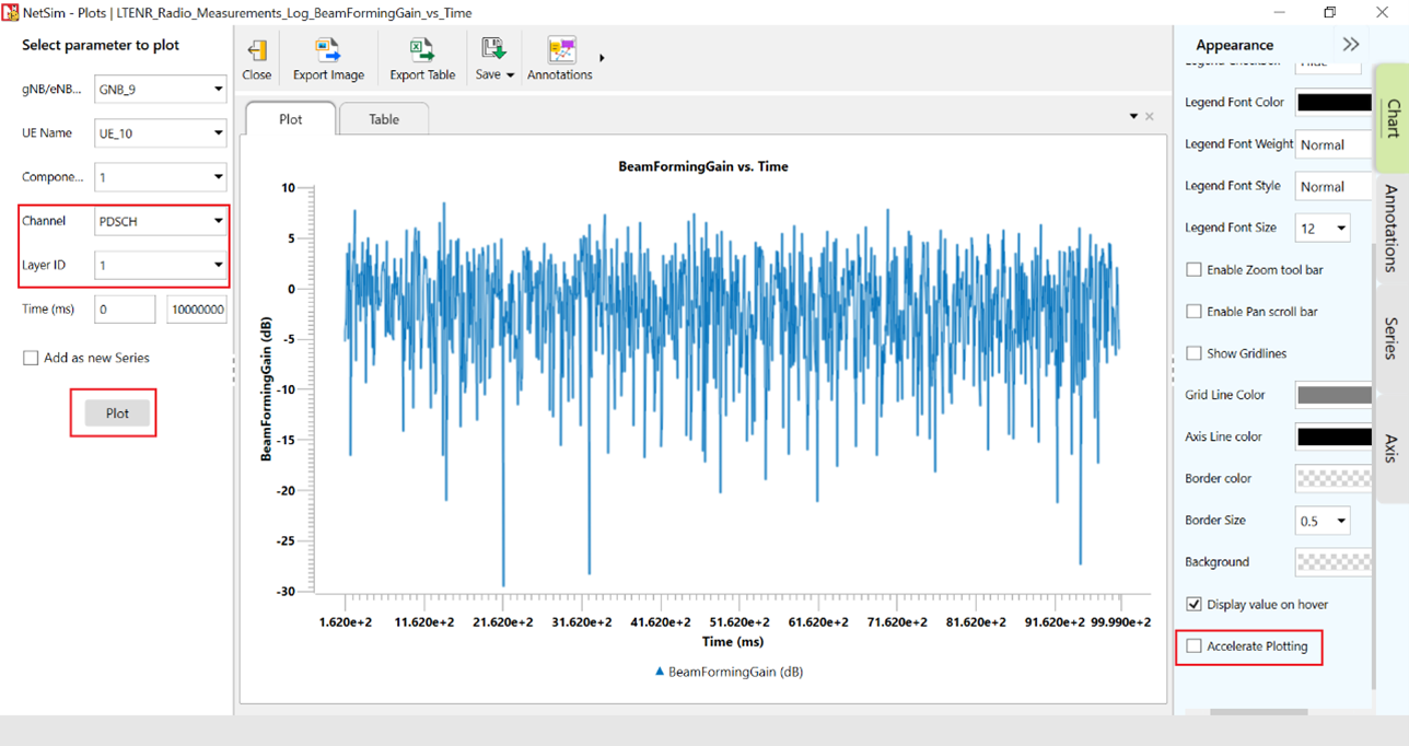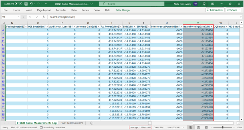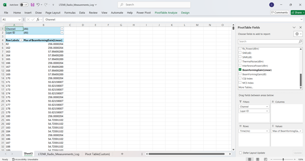 Drag and drop the Channel and LAYER_ID field to filter block. Filter the Channel to only PDSCH since we have considered a DL application from server to UE. Similarly, drag and drop the linear beamforming gain to values field and Time to Rows field. Here, the beamforming gain values are set to the maximum by right-clicking on the Value Field Settings and changing the sum to Max.