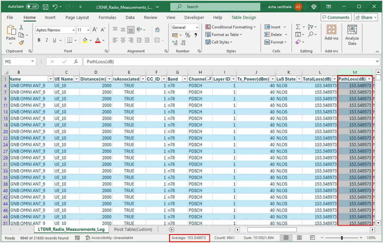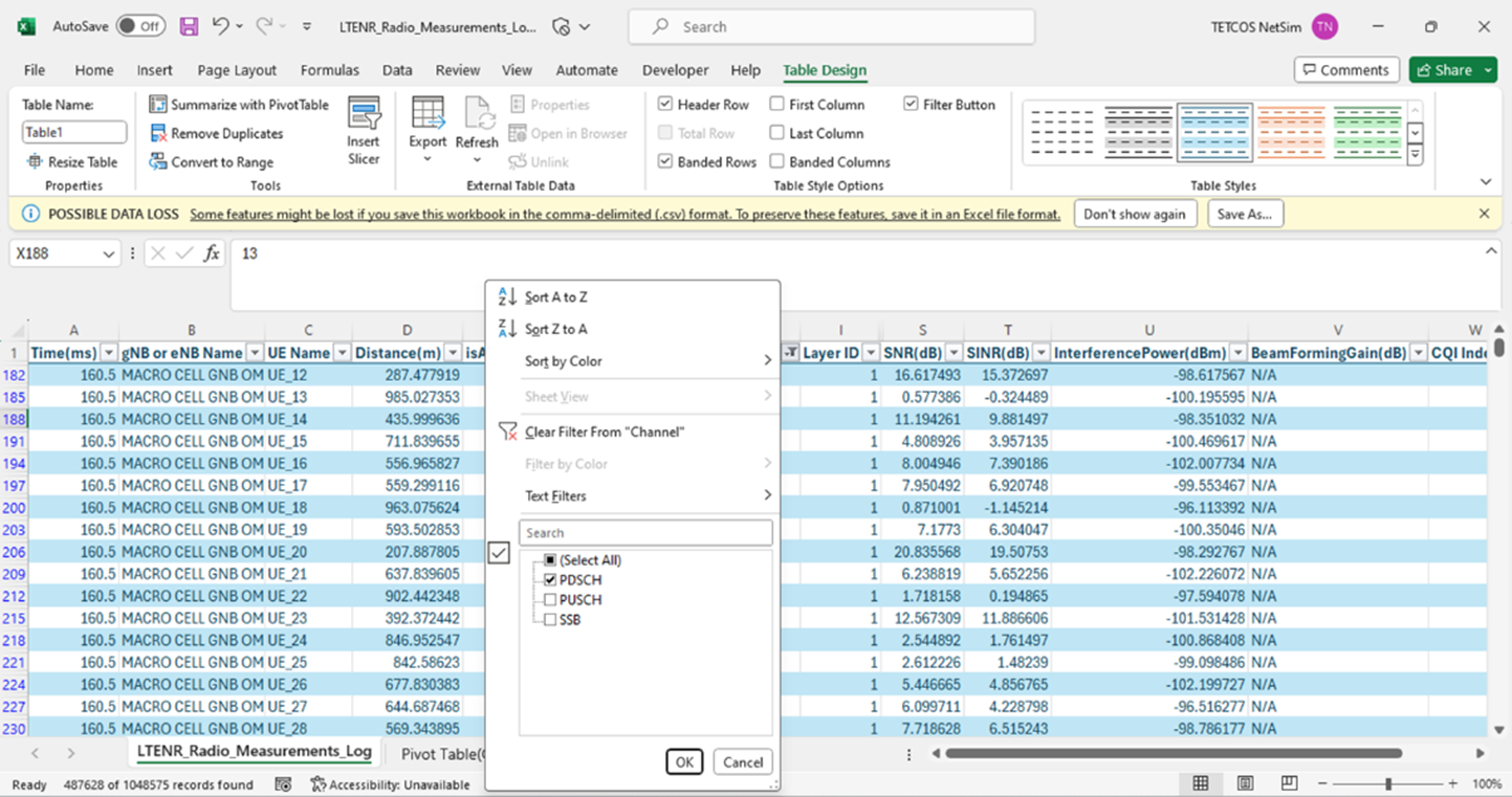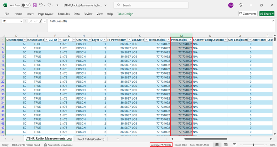 Figure-78: LTENR Radio Measurements Log file pivot table showing the filtering process of DL/UL column