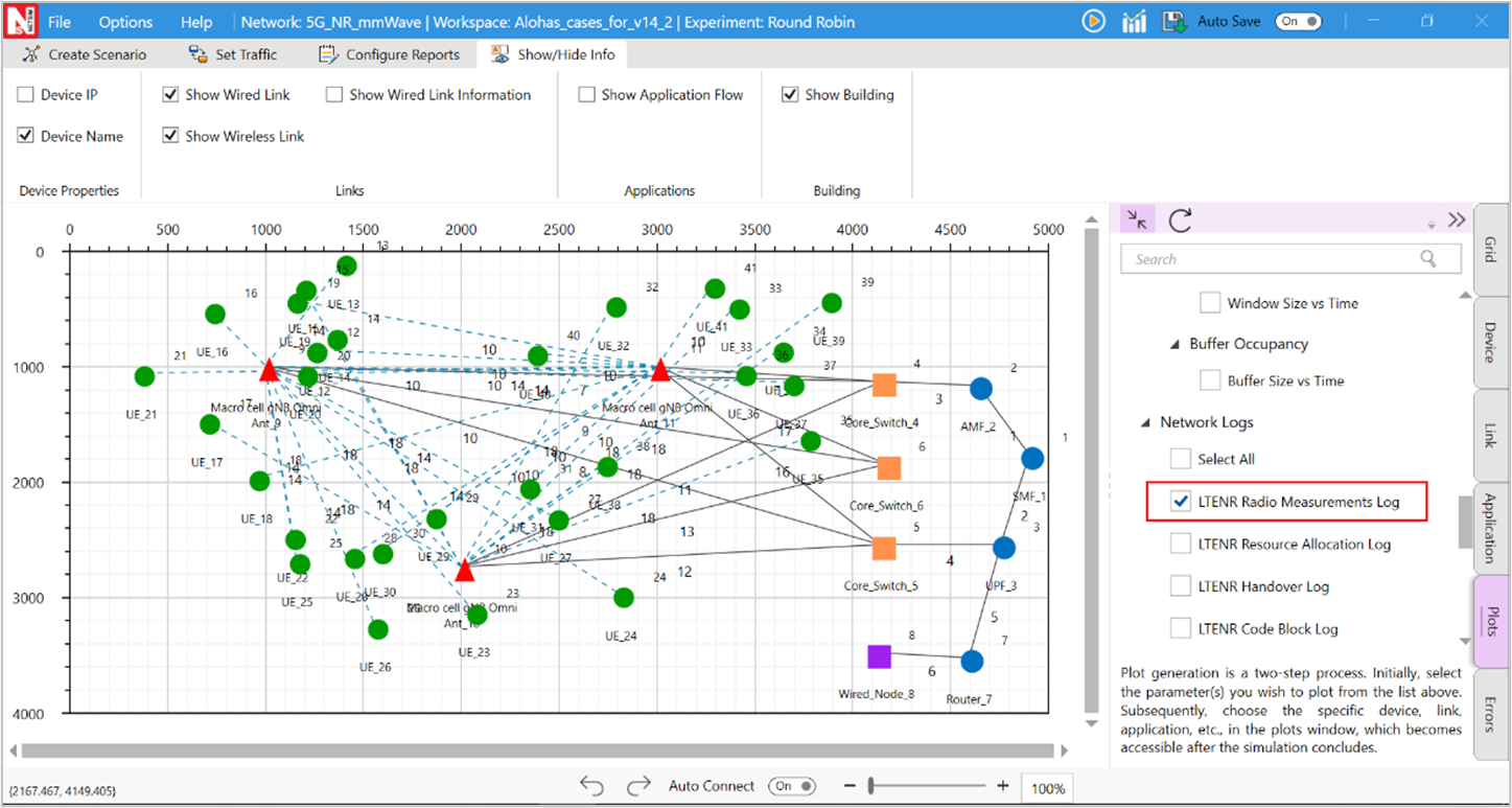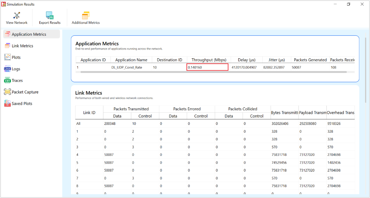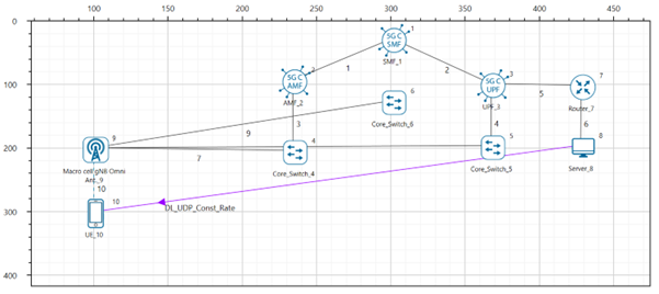 A downlink CBR application was configured from wired node to UE with Transport protocol as UDP and Packet Size of 1460 Bytes and Inter Arrival time of 179.69 µs and the Start Time was set to 1s.