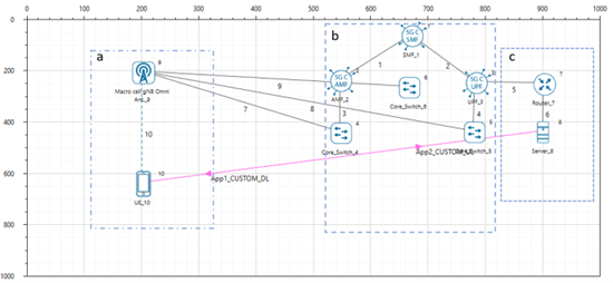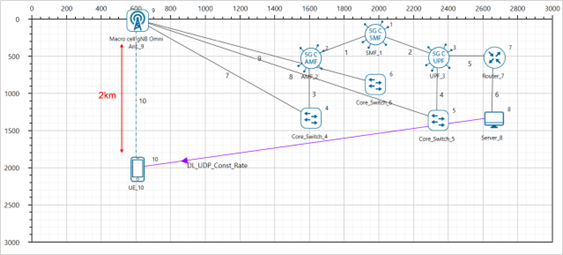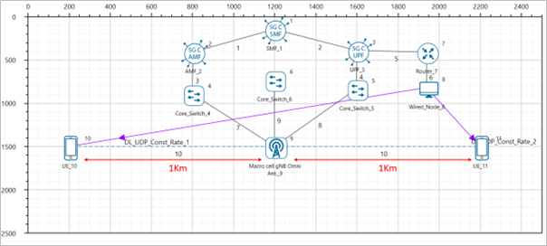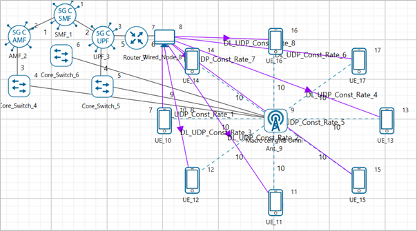 NetSim UI would display the network topology shown in the screenshot below when you open the example configuration file.