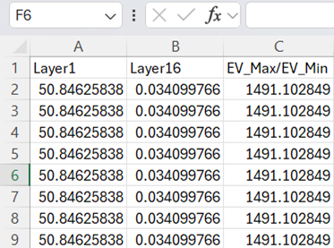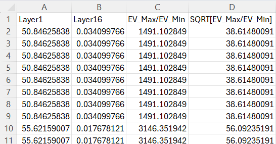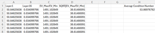 Now in the next column, enter the formula, \(= \lbrack@Layer1\rbrack/\lbrack@Layer16\rbrack\) to calculate \(EV\_ max/EV\_ min\) . Note that the eigenvalues of Layer 1 are \(\lambda_{\max}\) while the eigenvalue of Layer16 is \(\lambda_{\min}.\ \)Rename the column suitably.