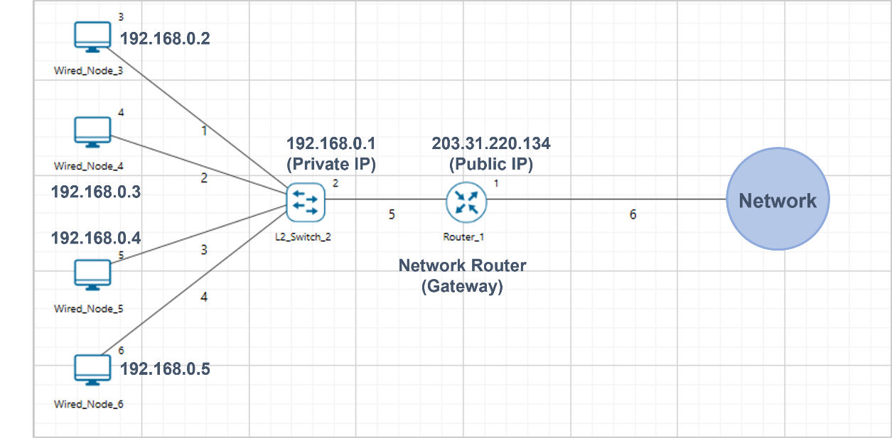 NAT is secure because it hides the internal network from the Internet. In the simple example shown above, all hosts inside the network use private addresses while the public-facing interface uses a real Internet address.
