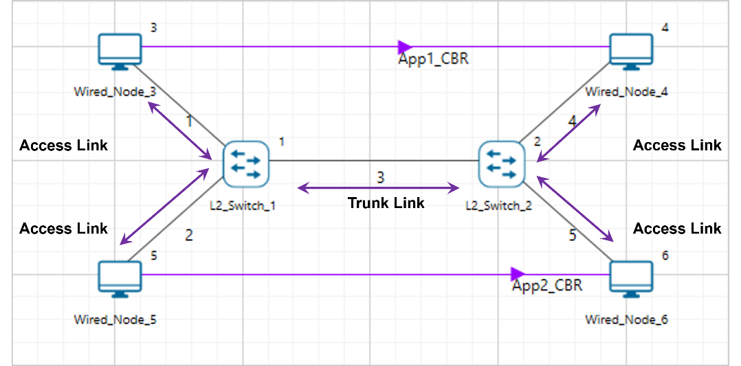 The links connecting the end devices are called access links. These links usually carry the data VLAN information. The link between switches is called a trunk link. It carries packets from all the VLANs.