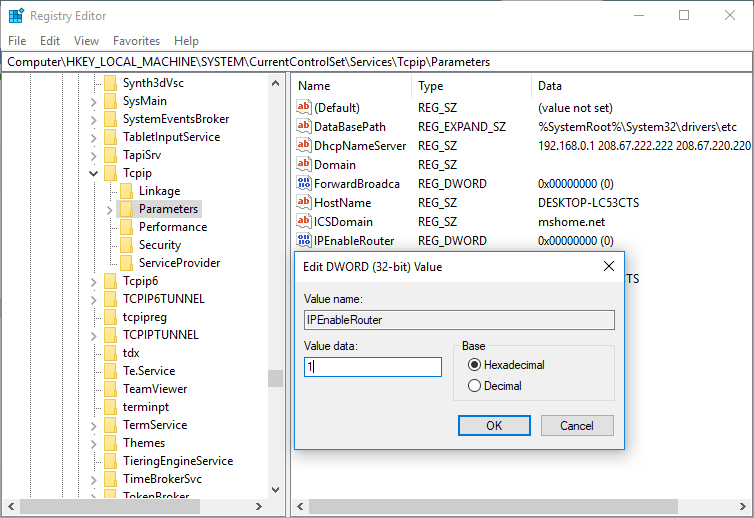 Navigate to the HKEY_LOCAL_MACHINE\SYSTEM\CurrentControlSet\Services\Tcpip\Parameters\IPEnableRouter setting