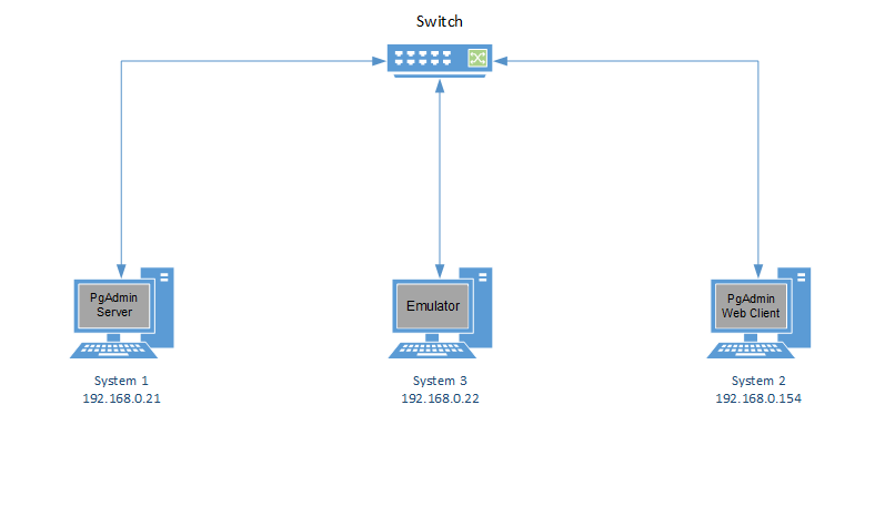 System 1(PgAdmin Server) \(\rightarrow\) System 3(NetSim Emulator) \(\rightarrow\) System 2(PgAdmin WebClient)