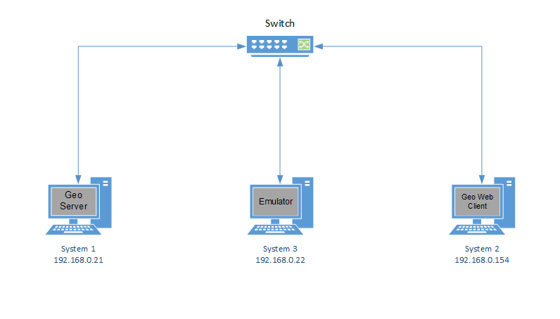 System 1(Geo Server) \(\rightarrow\) System 3(NetSim Emulator) \(\rightarrow\) System 2(Geo WebClient)