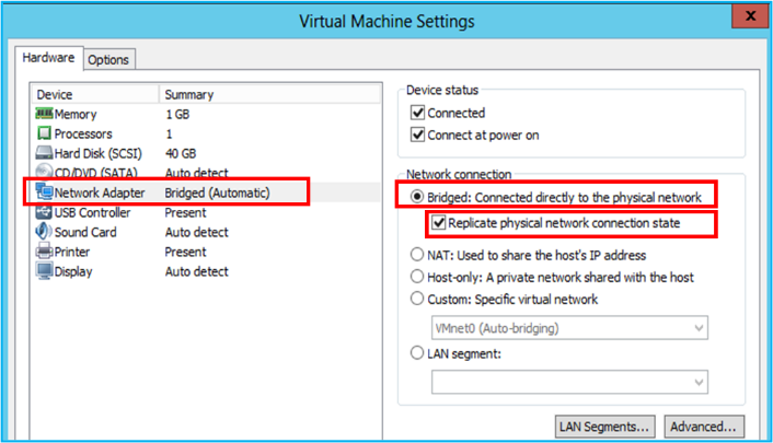 Now right click on each VM and select Settings. Click on Network Adapter, and select “Bridged: Connected directly to the physical network”. Also enable the “Replicate Physical network connection state”.