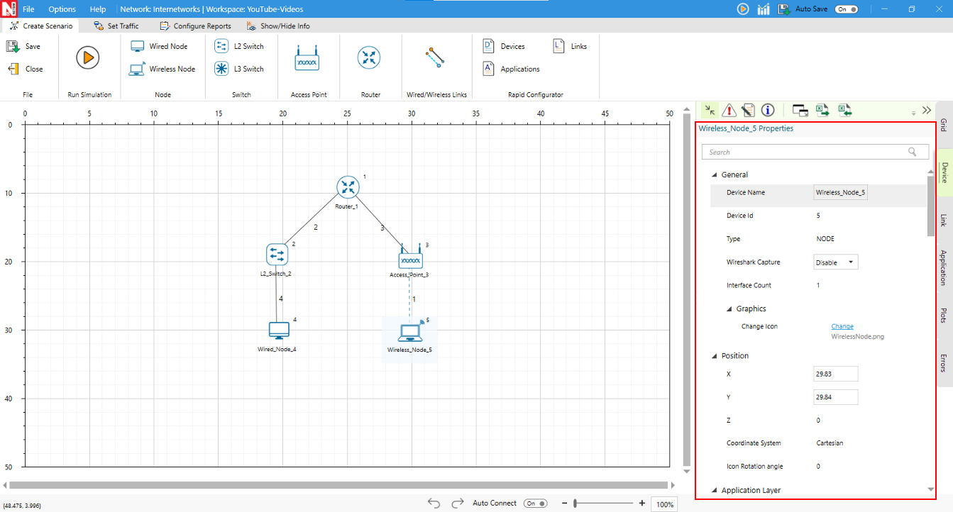 Clicking on any device (Router, Access Point, L2 Switch, Wireless Node, Wired Node, etc.) will open a right-side property panel, allowing users to set the parameters.