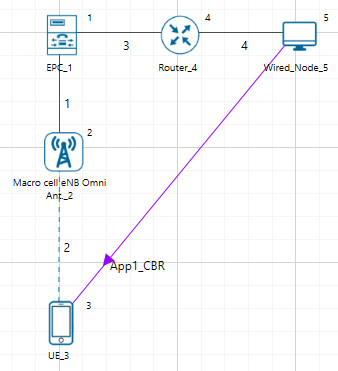A network with 1 Macro cell eNB, 1 EPC, 1 UE, 1 router, 1 wired node, and 1 unicast application running on the wired node.