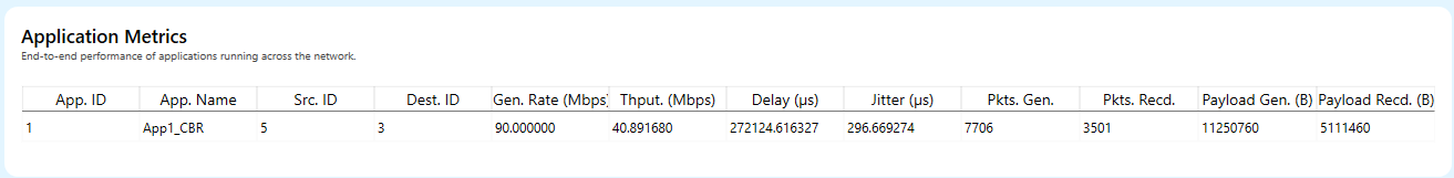To interpret the results, check the values of the throughputs in the Application Metrics Table window. You will see the following throughput values for Application 1 is 40.89 Mbps.