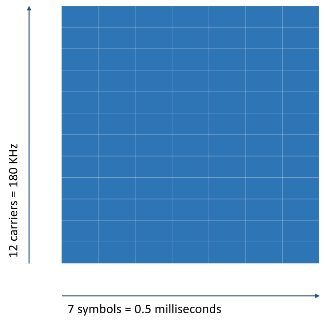 One Resource Block (RB) in LTE has 12 carriers (each carrier is 15 kHz) in frequency domain and 0.5 milliseconds (7 symbols) in time domain.