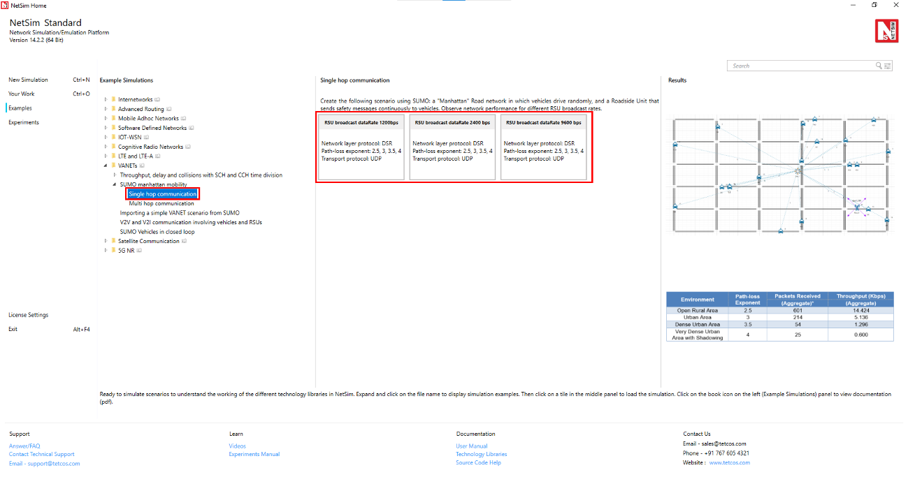Open NetSim and Select Examples > VANETs > SUMO Manhattan mobility > Single hop communication then click on the tile in the middle panel to load the example as shown in below screenshot.