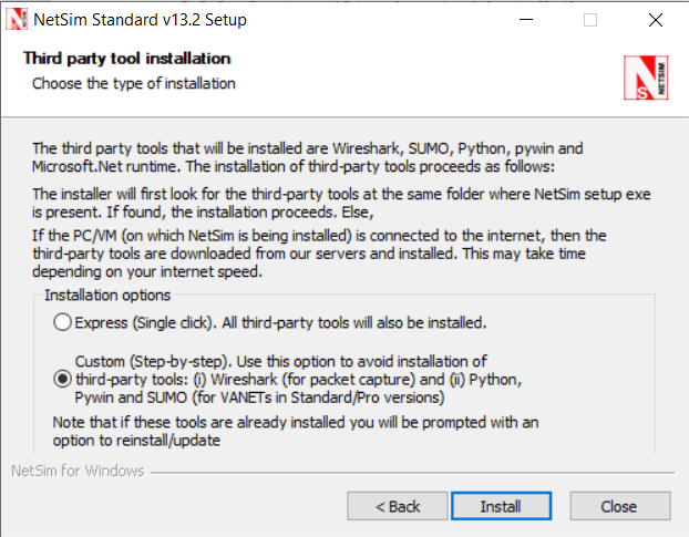 Custom Installation is a step-by-step approach in which a user will be prompted to carry out the installation process and the same applies to the installation of the third-party tools which happens alongside with NetSim.