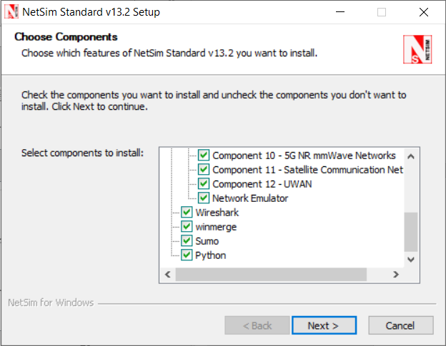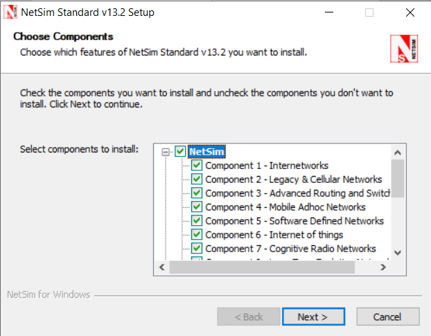 Now the user will be prompted to select the components to be installed. The list of components is available for selection and assembly only in the Standard and Pro versions of NetSim. NetSim Academic version is available as a single package.