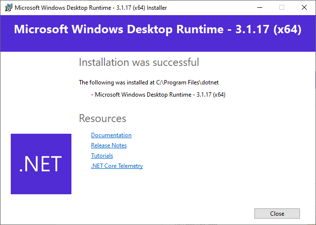 Figure 2‑23: Dot NET (.NET) installation successfully completed