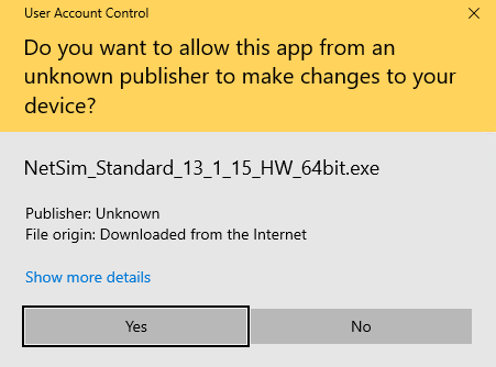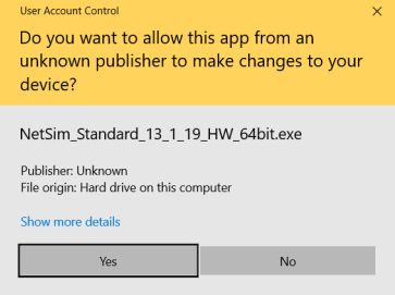 For example, you will see NetSim_Standard_13_2_15_HW_64bit.exe for a Standard version install. Double click on the setup file. Click on Yes button to install the software.