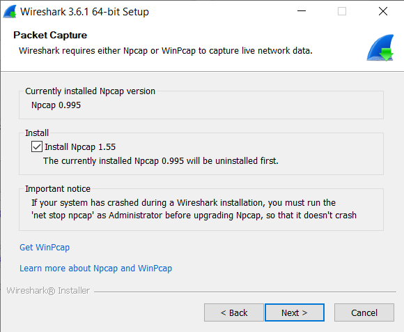Select Install Npcap 0.995 and click on Next button.