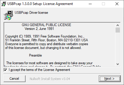 Figure 2‑33: USBPcap Driver License Agreement window