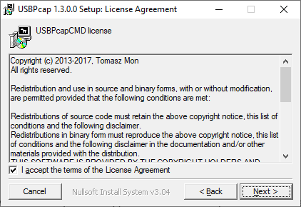 Figure 2‑34: USBPcap CMD License Agreement window