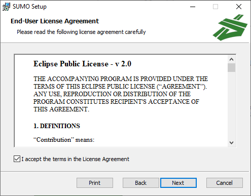 SUMO License Agreement appears. Accept the terms in license agreement and click on Next to proceed installation