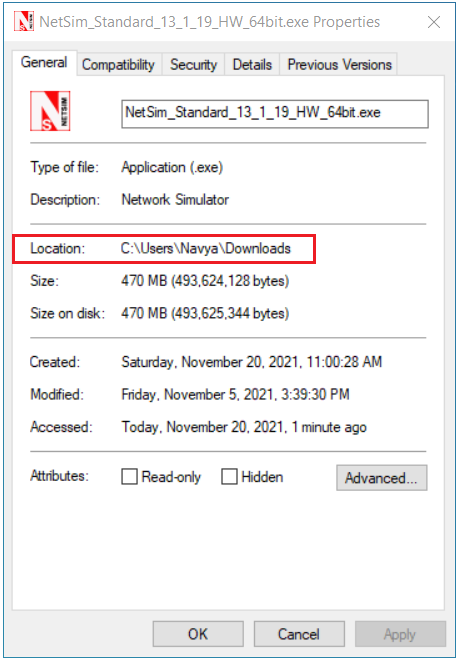 - For example, let us take the NetSim_Standard_13_1_19_HW_64bit.exe setup. Right click on NetSim Standard 64-bit setup à Go to properties and copy the Location as shown below.