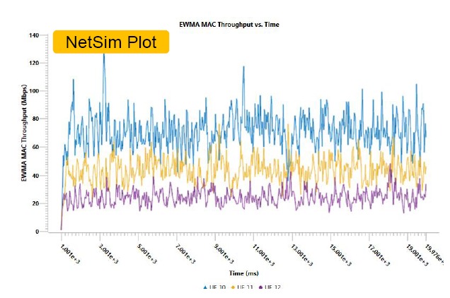 We have a scenario with 3 UEs at different distances, each seeing a time-varying radio channel, scheduled using the proportional fair algorithm. The results are as shown: