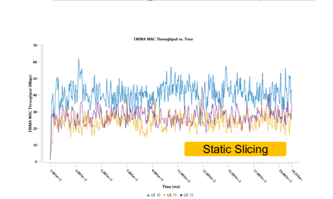From (a), we observe that UE12 is currently achieving only 24.50 Mbps. To meet the 30 Mbps target, additional PRBs must be allocated to UE12. We create an eMBB slice and associate UE 12 to it. We see NetSim results from two slicing options: static resource allocation and dynamic resource allocation.
