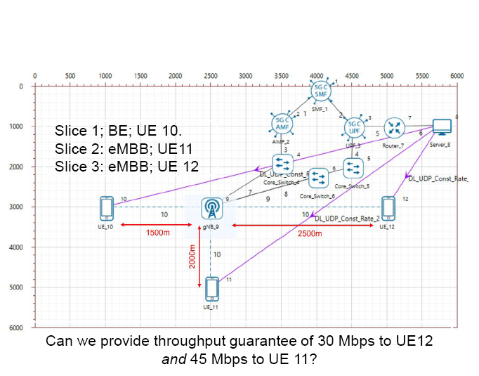 We consider the same scenario as in (a) and create two eMBB slices. We associate UE12 to one slice and UE11 to another slice; then configure a GBR of 30 Mbps to UE12 and 45 Mbps to UE11